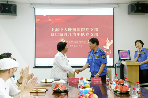 上海中大肿瘤医院党支部代表与虹口城管江湾中队相关负责人开展交流座谈,就进一步加强共建联建、整合资源、共同发展等工作内容进行探讨,并签署了《共建联建协议书》,双方党支部负责人分别代表单位在协议上签字。