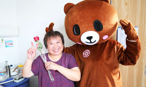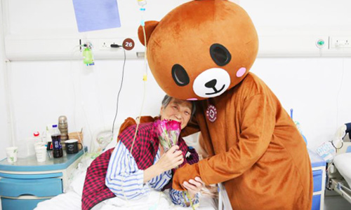 此次布朗熊的出镜,让很多躺在病床上的患者以及家属们感到非常的亲切,呆萌的表情,笨拙的走姿,手中的鲜艳玫瑰,一时间成为“院宝”。