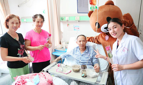 这次活动的对象是针对七夕节当天来院和住院的女性朋友,送玫瑰活动整个流程持续了一个多小时,参与者都是用手中的玫瑰表示对患者的祝福,尤其是穿着布朗熊人偶的小熊,在三十多度的高温下,依然坚持身穿厚重的人偶服装,为每一位女性患者送上个节日的祝福:上海中大肿瘤医院全体人员祝大家节日快乐。