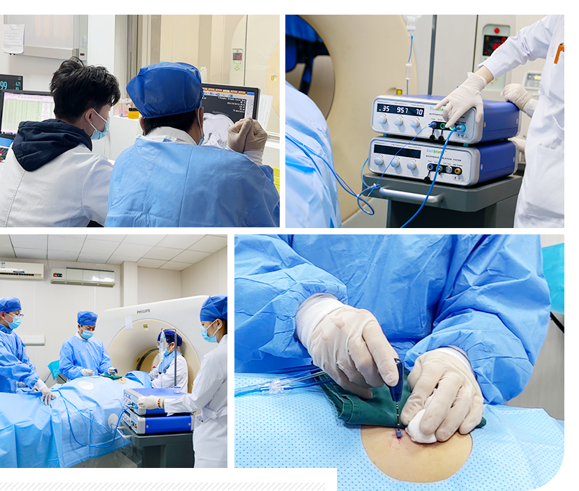 将一根细小的消融针经皮穿刺进入肿瘤组织,利用微波消融产生的高温效应使肿瘤组织脱水、凝固、坏死,失去活性,从而达到病灶逐渐缩小甚至消失的效果。